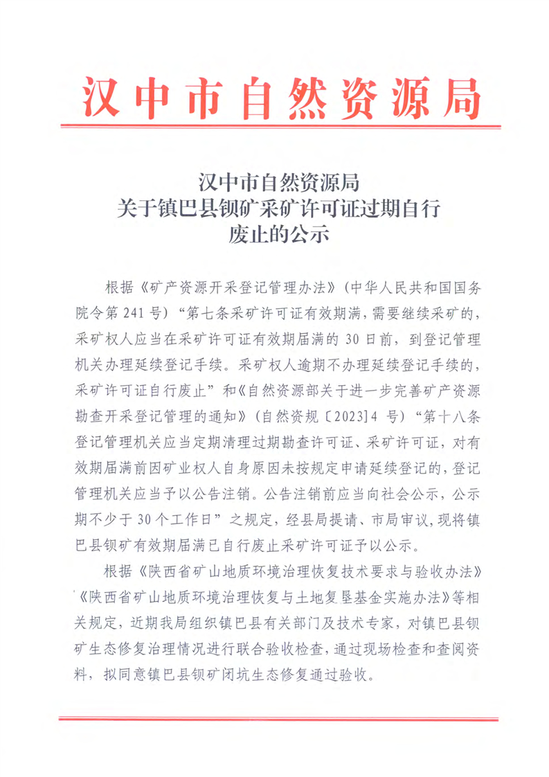 关于镇巴县钡矿采矿许可证过期自行废止的公示
