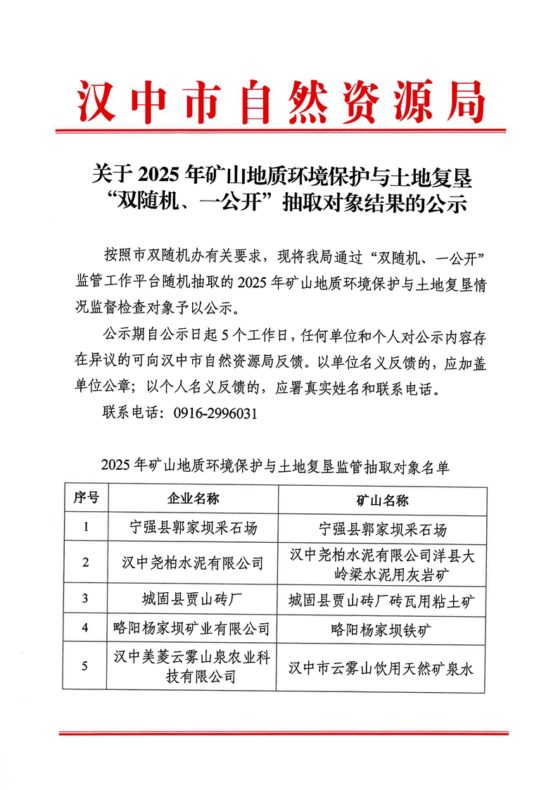 汉中市自然资源关于2025年矿山地质环境保护与土地复垦 “双随机、一公开”抽取对象结果的公示