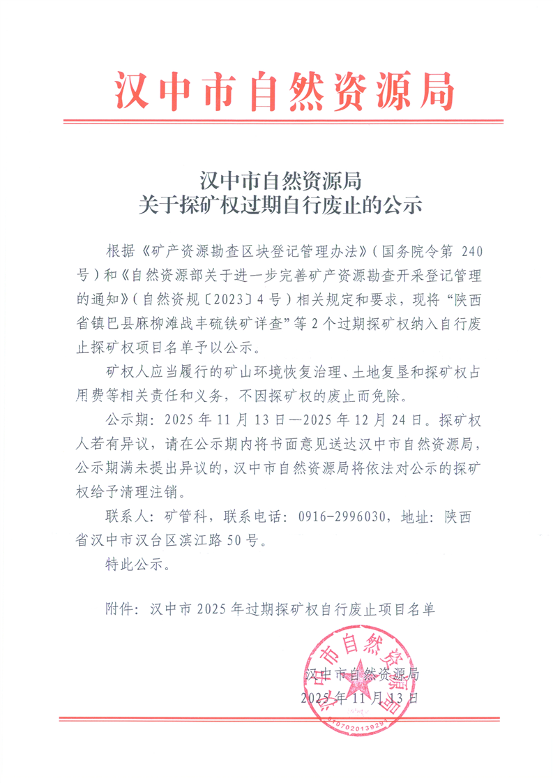 汉中市自然资源局关于探矿权过期自行废止的公示