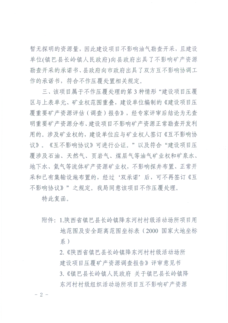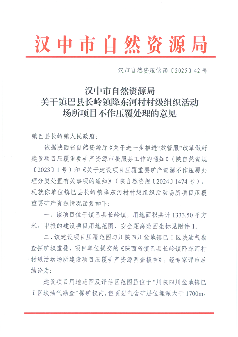 汉中市自然资源局关于镇巴县长岭镇降东河村村级组织活动场所项目不作压覆处理的意见