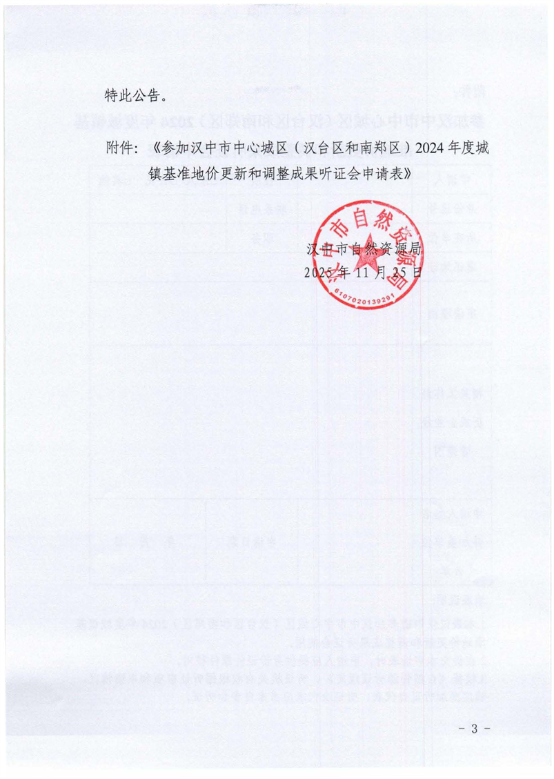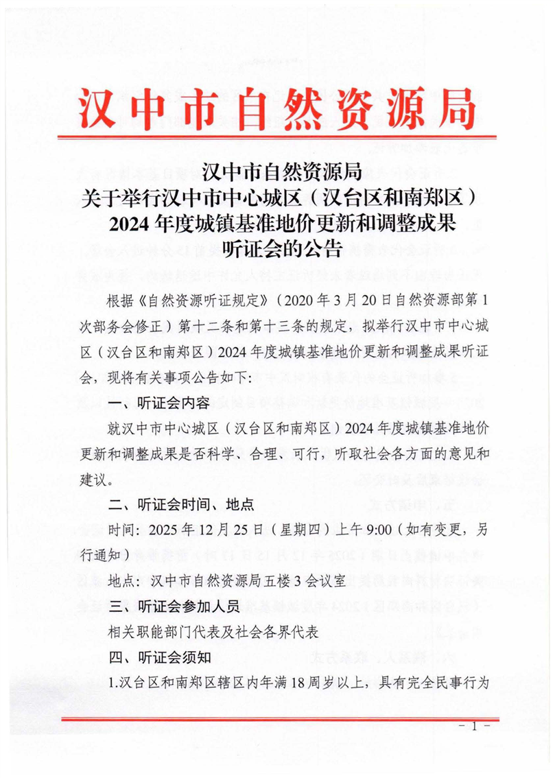 汉中市自然资源局关于举行汉中市中心城区(汉台区和南郑区)2024年度城镇基准地价更新和调整成果听证会的公告