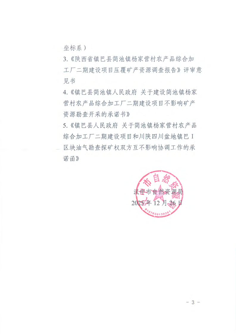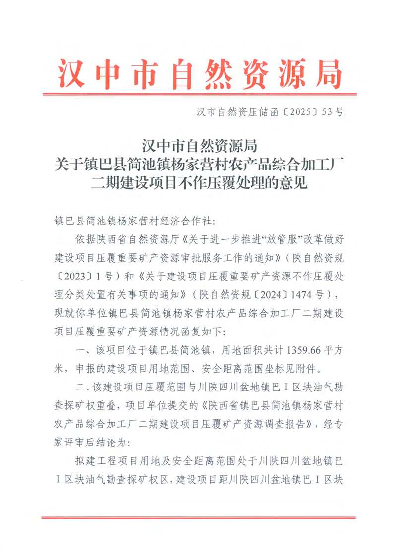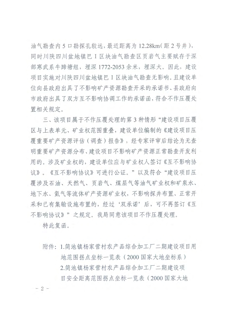 关于镇巴县简池镇杨家营村农产品综合加工厂二期建设项目不作压覆处理的意见