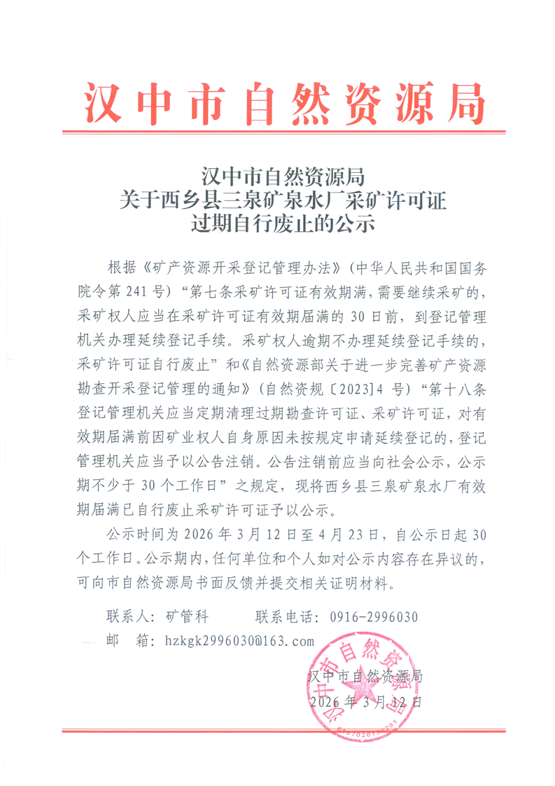 汉中市自然资源局关于西乡县三泉矿泉水厂采矿许可证过期自行废止的公示