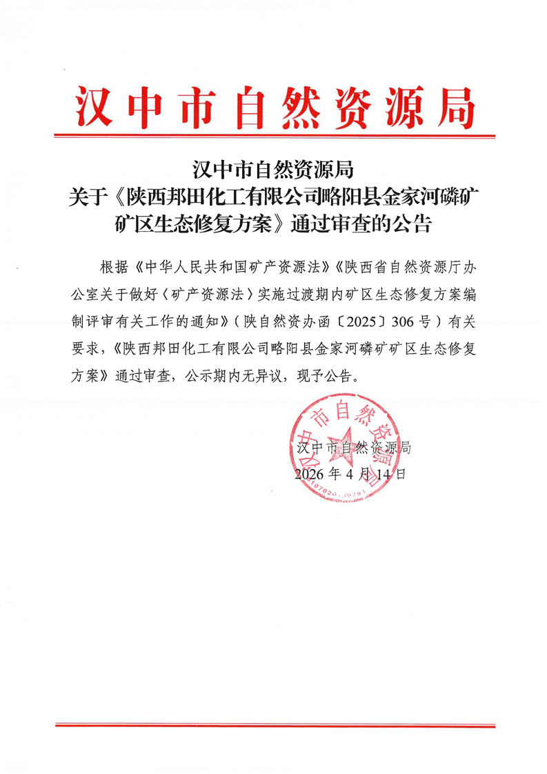 汉中市自然资源局关于《陕西邦田化工有限公司略阳县金家河磷矿矿区生态修复方案》通过审查的公告